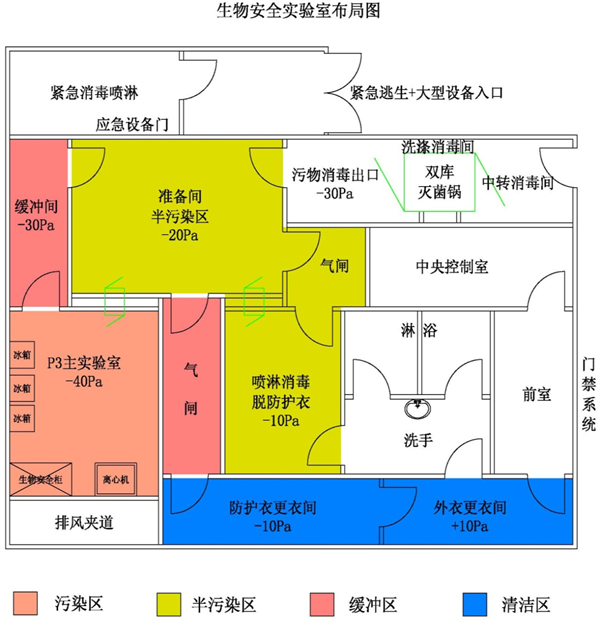 (1)污染区:是直接操作危险生物因子的区域。正常的操作在安全柜内进行,室内不易污染,但是有严重污染的可能。污染区内可设单个或多个主实验室(安全柜室)。