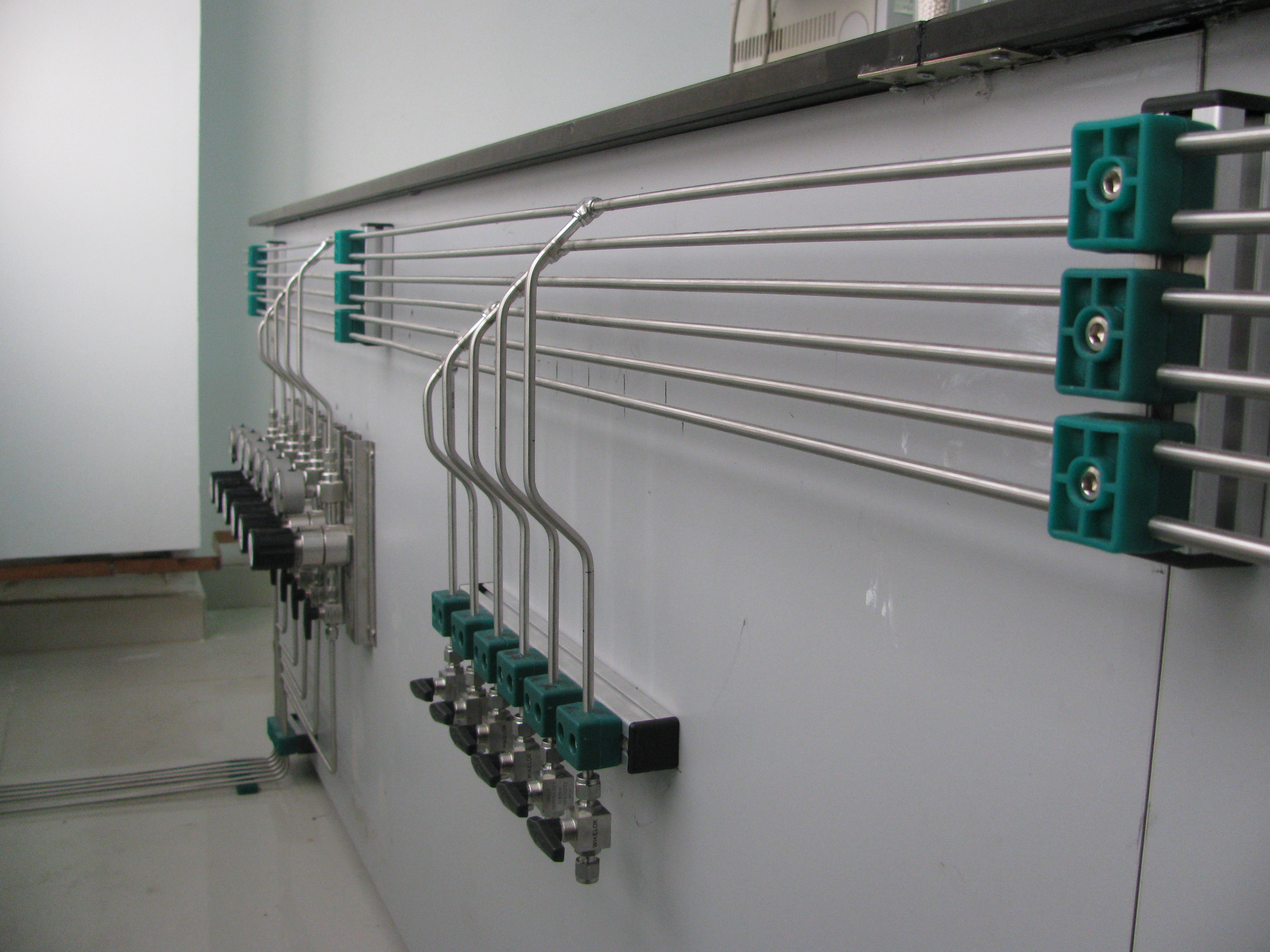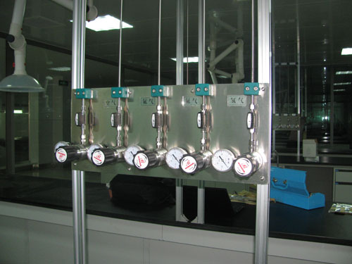 (2)集中供气是将各种实验分析仪器需要使用的各类气体钢瓶,全部放置在实验室以外独立的气瓶间内,进行集中管理,各类气体从气瓶间以管道输送形式,按照不同实验仪器的用气要求输送到每个实验室不同的实验仪器上。整套系统包括气源集合压力控制部分(汇流排)、输气管线部分(EP级不锈钢管)、二次调压分流部分(功能柱)以及与仪器连接的终端部分(接头、截止阀)。整套系统要求具有良好的气密性、高洁净度、耐用性和安全可靠性,能满足实验仪器对各类气体不间断连续使用的要求,并且在使用过程中根据实验仪器工作条件对整体或局部气体压力、流量进行全量程调整以满足不同的实验条件的要求。
