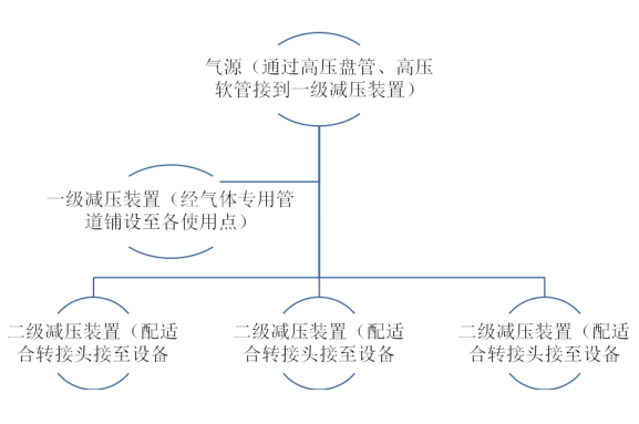 气源集中存放,通过一级减压装置输送至各用气点,各气体可采用单瓶、双瓶、多瓶,手动或自动切换等一级减压装置,可配排空、压力监控报警、紧级切断等控制系统,时时监控气源动态;为保证供气安全气源室安装气体泄漏报警系统、阻火器、通风系统,通风系统可做定时排风、手动排风与气体泄漏报警后强行排风合为一体,以保证气源室空气流通;经一级减压装置通过专用供气管道铺设至各用气终端;在各用气终端安装相应的二级减压装置与阀门,配备相应的设备转接头接至用气设备;各设备使用者均无需至气源室操作,只需操作用气设备边上的阀门就可使用设备。